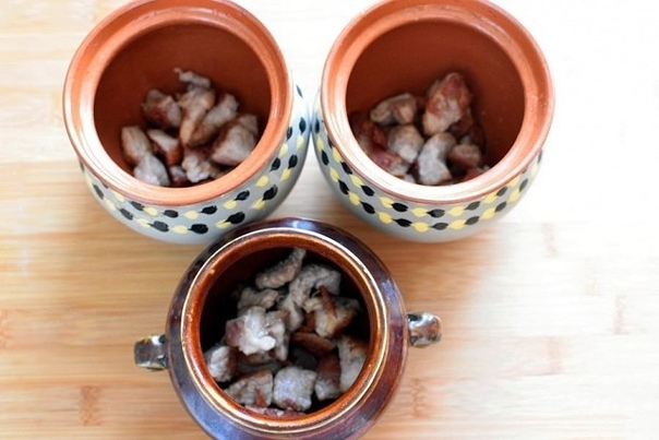 2. Свинину нарежьте кубиками и обжарьте на растительном масле до румянца. На дно в горшочки положите по паре горошин перца и выложите обжаренное мясо. Посолите по вкусу.