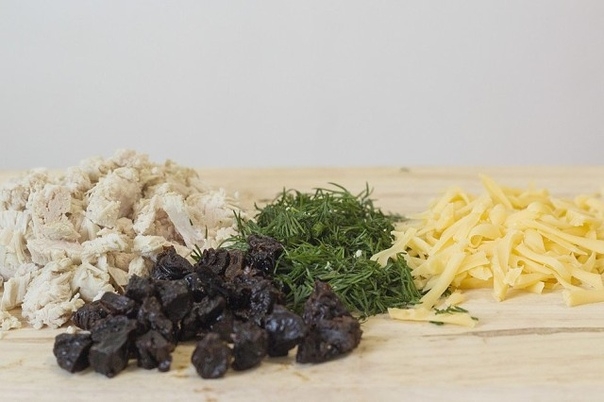 1. Подготовить продукты, отварить филе. Мясо, чернослив и укроп порезать, сыр натереть на крупной тёрке.