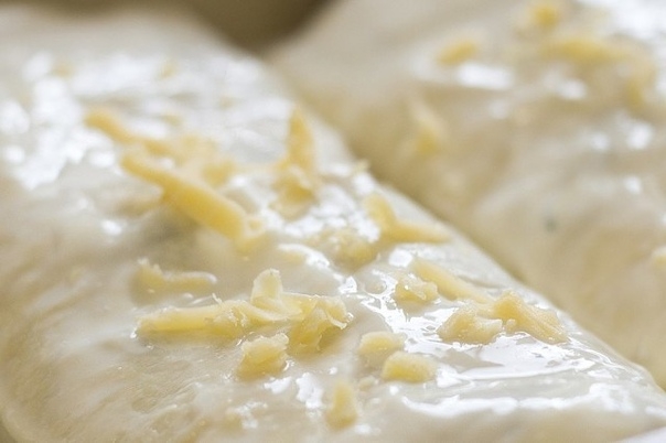 4. Скрутить в рулет, выложить в форму, залить молочной смесью, присыпать остатками сыра.