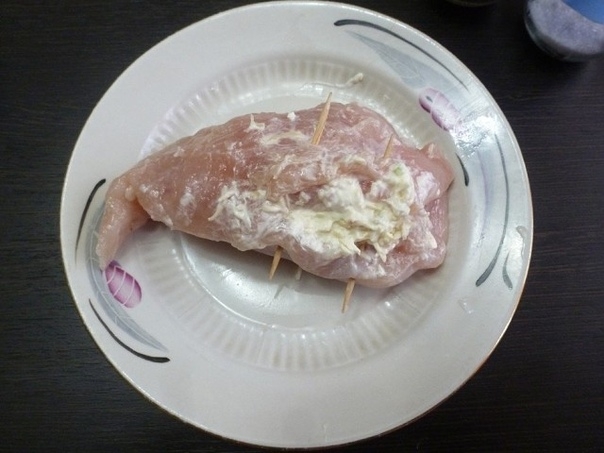 1. Куриные грудки помыть, обсушить. В толстой части сделать разрез-карман. Старайтесь не прорезать мясо насквозь. Посолить снаружи и внутри.