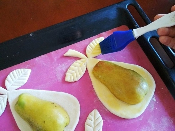 2. Тесто разделить на равные части, рассчитывая на 4 груши. Затем слегка вдавить грушу (чтобы виден был ее контур) и, отступив 1 см от ее краев, вырезать заготовку с листочками.