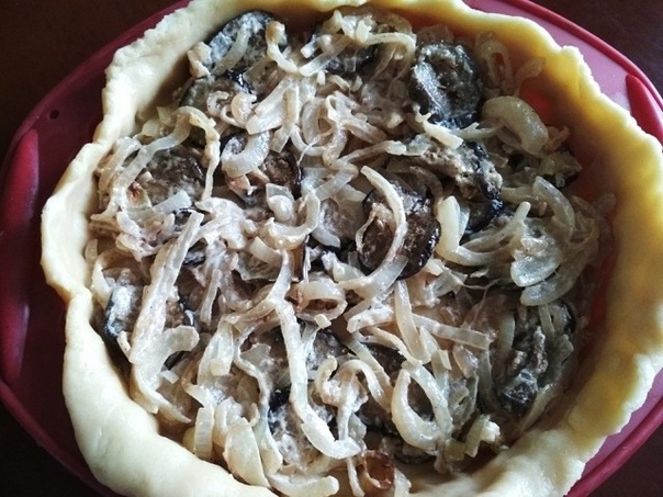 4. Тесто разделить на 2 неравные части. Большую раскатать и выложить в форму. Положить поверх теста лук и баклажаны (перемешать). Сверху накрыть оставшимся тестом.