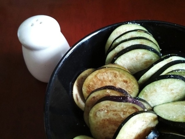 1. Баклажаны нарезать кружочками. Посыпать солью и дать стечь горькому соку. Оставить на 10 минут.