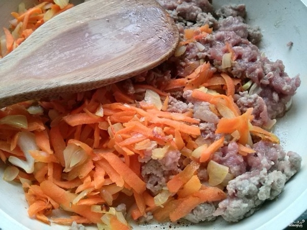 Добавьте фарш, перемешайте его и слегка обжарьте.