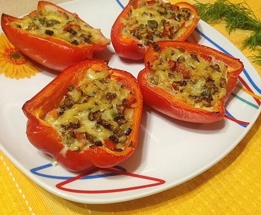 8. Распределяем начинку по половинкам перцев, ставим все в разогретую духовку.