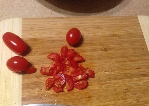 5. Нарежем небольшими кусочками помидоры черри. Можно взять обычный помидор, но использовать его без сердцевины с семечками.