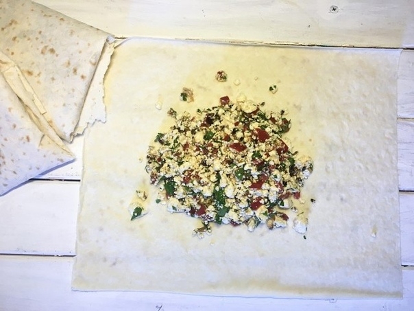 3. На середину лаваша выложить начинку и свернуть конвертиком, поджимая края вовнутрь. Конвертики обжарить с обеих сторон на сухой сковороде.
