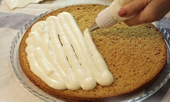 Медовый корж для торта немного остудить, и пока теплый - разрезать на 3 части.