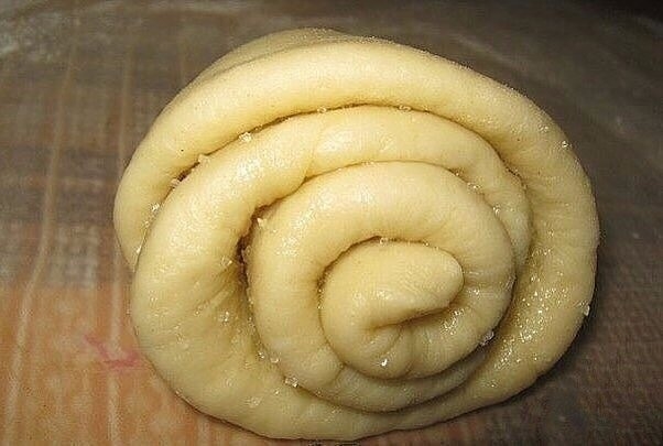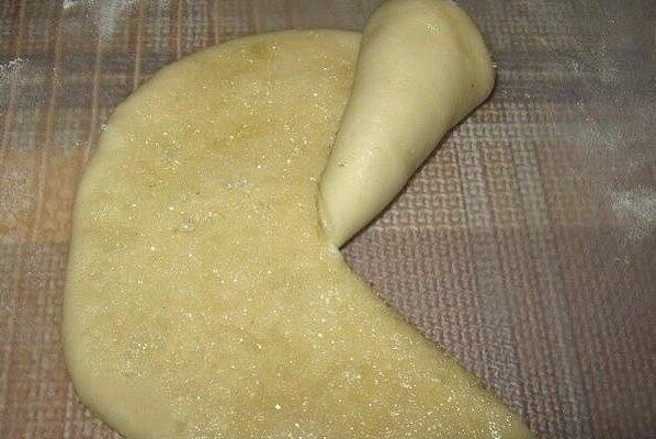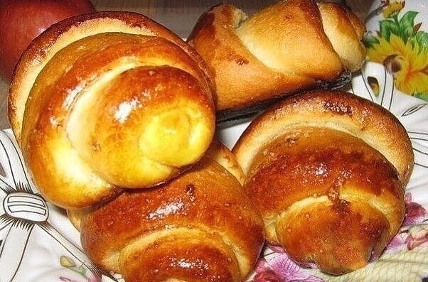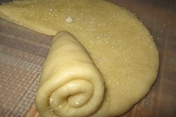 Готовое тесто разделить на шарики, величиной, как маленькое яйцо и раскатать их в тонкие лепешки. Каждую из них смазать растительным маслом, посыпать сахаром и сделать надсечку острым ножом от средины до края. С одной стороны лепешки поднять край и скатать по кругу в рулет-конус. Выложить плюшки на противень с бумагой для выпечки, дать расстояться минут 15-20 (можно смазать желтком) и поместить в духовку, разогретую до 190 градусов. Выпекать около 30 минут до готовности. При выпечке плюшки подымутся и разойдутся – получатся красивые завитушки. При подаче посыпать сахарной пудрой