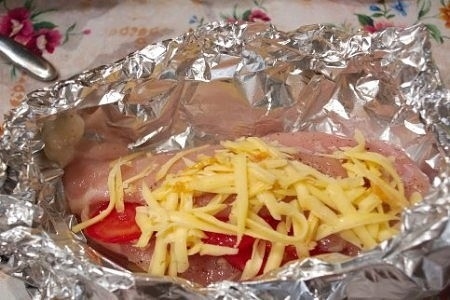 Из фольги делаем формочку. Выкладываем куриное филе. Сверху посыпаем тертым сыром.