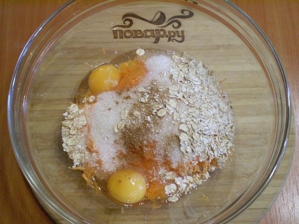 К тертой тыкве добавьте сырые яйца, сахар, корицу и ванилин. Овсяные хлопья — по желанию.