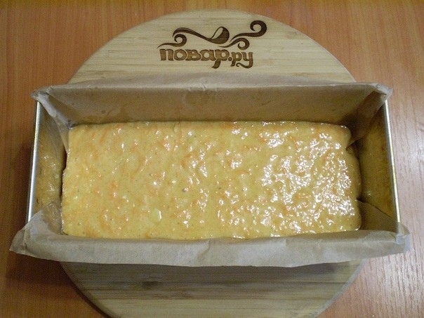 Форму для выпечки смажьте маслом или застелите промасленной бумагой. Тесто перелейте в форму и отправьте в разогретую духовку на 40 минут. Выпекайте при 180 градусах.