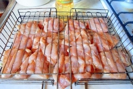Решётку смазываем растительным маслом, выкладываем куски мяса, довольно плотно, но так, чтобы куски не сильно соприкасались друг с другом (в противном случаем, в местах соприкосновения мяса будет дольше прожариваться и есть риск пересушить грудку). Жарим на углях, до румяной корочки и прозрачного сока при прокалывании мяса.