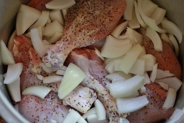 1. Поместите помытые и очищенные от кожицы голени в кастрюлю, туда же добавьте очищенный и разрезанный на четыре части лук, поперчите и посолите. Влейте в кастрюлю 1,5 стакана воды.