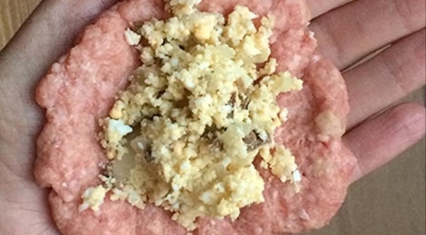 2. Тщательно смешиваем фарш, яйцо, измельченный в блендере хлеб. Отщепляем влажными руками небольшое количество, делаем лепешку, кладем начинку и тщательно защипляем края.