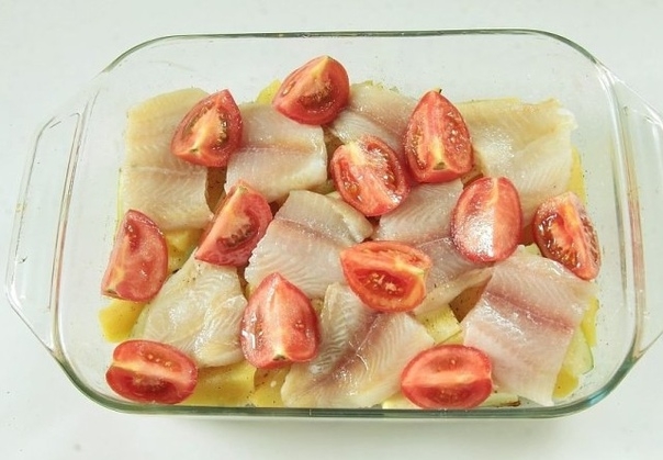 4. Отправьте форму в духовку и готовьте 20–25 минут при 200°С. Достаньте и распределите сверху нарезанные крупными дольками помидоры и нарезанное порционно филе любой белой рыбы. Посыпьте солью и сбрызните оливковым маслом.
