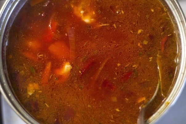 3. Картофель почистить, нарезать брусочками, бросить в мясной бульон, варить 7 минут. Добавить в бульон тушеные овощи, варить 5 минут, посолить.