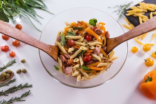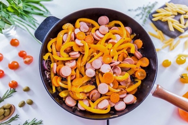 1. Отварите пасту. Нарежьте сосиски. Нарежьте овощи.