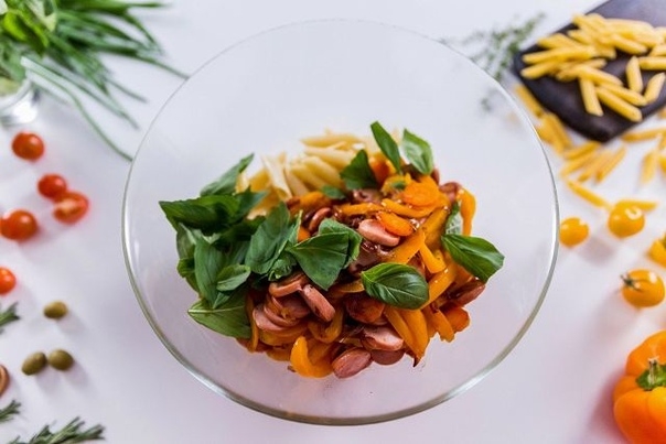 2. Обжарьте сосиски с овощами. Смешайте с теплой пастой. Добавьте листья базилика и черри.