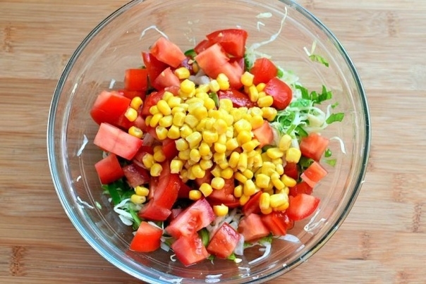 4. Выложите помидоры, нарезанные кубиками, и хорошо обсушенную кукурузу. Посолите и поперчите по вкусу.