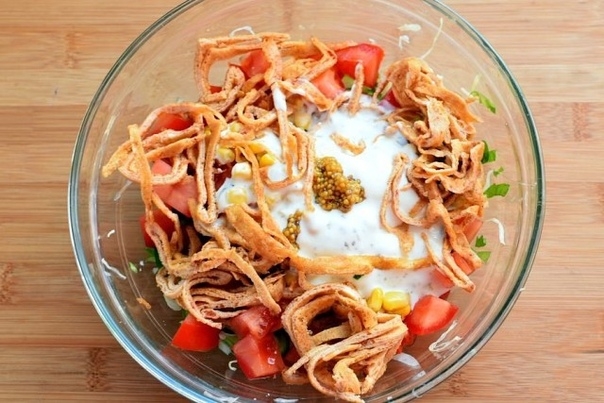 5. Добавьте в салат яичные блинчики и заправьте по вашему вкусу.