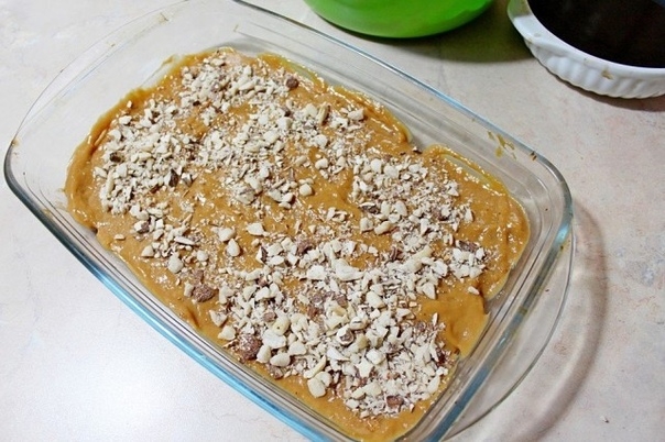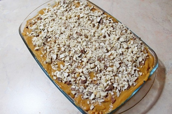 6. Начинаем собирать наш торт. В форму выложить печенье ровным слоем, предварительно быстро окунув его в кофе. Поверх выложить 1/3 части крема, разровнять. Сверху присыпать 1/3 измельченными орехами.