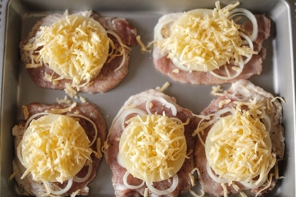 Выложить поверх лука кольца ананаса и посыпать тертым сыром.