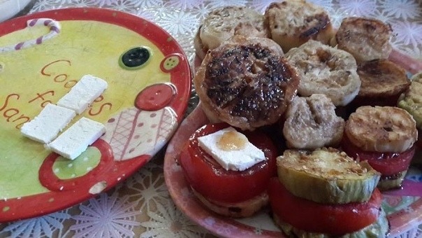 Баклажаны отлежались. Осушаем их кухонной бумагой и жарим с обеих сторон до полуготовности. Выкладываем опять на бумагу. Пока остывают, готовим начинку для них. Режем тонко помидор кружочками, чеснок пластинами и брынзу тоненькими пластинами. Аккуратно ножом снимаем кожуру с баклажанов (она вредная).И делаем типа сэндвич: на кружочек баклажана кладем кружочек помидора, пластинку брынзы и пластинку чеснока. Сверху закрываем другим баклажаном.