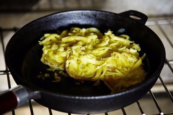8. Обжаренный картофель переложить на чугунную сковородку, посыпать натертым на крупной терке сыром и отправить в разогретую духовку.