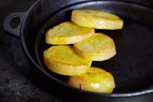 5. Для гарнира нарезанный картофель обжарить на сковороде до золотистой корочки.