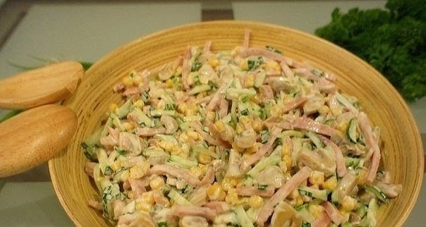 Идеальное сочетание продуктов! Сладкая кукуруза оттеняет вкус маринованных грибов и ветчины, а свежий огурец смягчает всю палитру вкусов. Скорее пробуйте, Вам понравится!