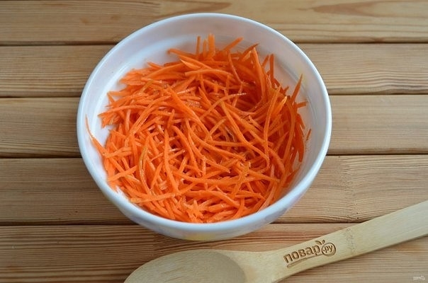 2. Натираем морковь длинной соломкой с помощью специальной терки. Если таковой нет, можно постараться нарезать.