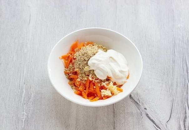 4. Сметану перемешайте с горчицей, заправьте морковь с орехами и чесноком. Посолите и поперчите начинку по вкусу.