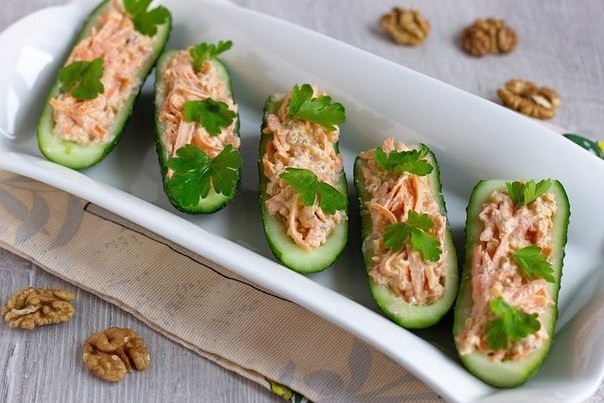 6. Выложите начинку в лодочки из огурцов и украсьте зеленью петрушки.
