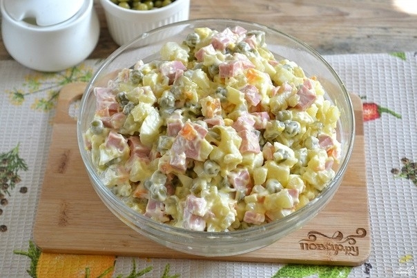 Салат "Оливье" очень простой в приготовлении, и каждая хозяйка сможет побаловать своих родных и гостей этим вкусным и сытным блюдом. Залогом успеха в приготовлении салата являются правильно подобранные ингредиенты. Вареная колбаса должна быть свежей и качественной. Ее цена не должна быть ниже цены мяса.