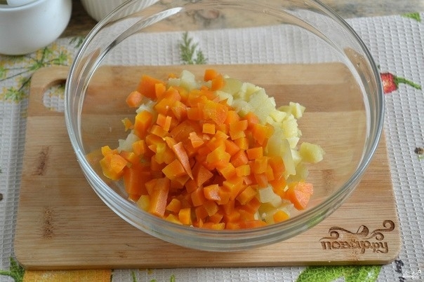 Порежьте средним кубиком морковь и картофель. Измельчить их также можно при помощи сеточки (винегретницы), которая ускорит процесс приготовления.