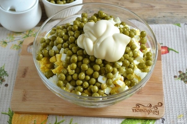 Добавьте маринованный горошек, посолите и перемешайте. Добавьте майонез.