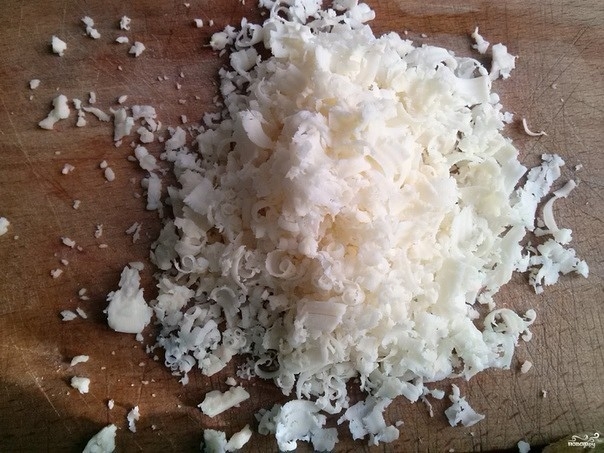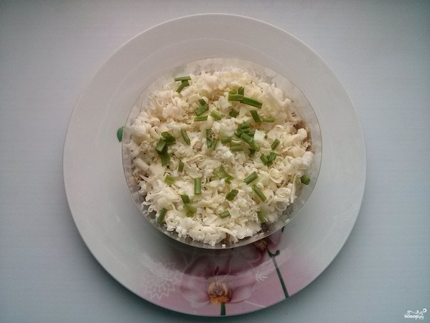 3-й слой: сыр. Сверху выкладываем немного порезанного зеленого лука.