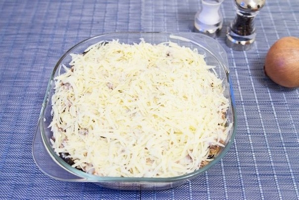Сверху положите тертый сыр и запекайте в духовке 40 минут при температуре 180 градусов