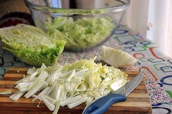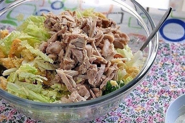 1. Курицу либо просто сварить, либо отварную курицу слегка обжарить до золотистого цвета. Нарезать капусту тонкими полосками. После капусты нарезать помидоры небольшими дольками. Сыр