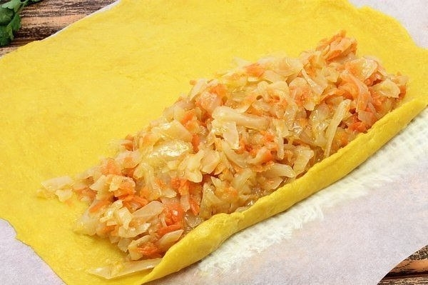 6. Раскатываем тесто толщиной 2-3 мм, например, прямоугольником. С одного продольного края выкладываем уже охлажденную тушеную капусту.