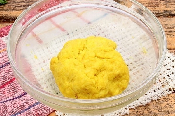 5. Проводим замес минуты 3-4. За это время масса перестанет липнуть к ладоням, равномерно окрасится в желтый.