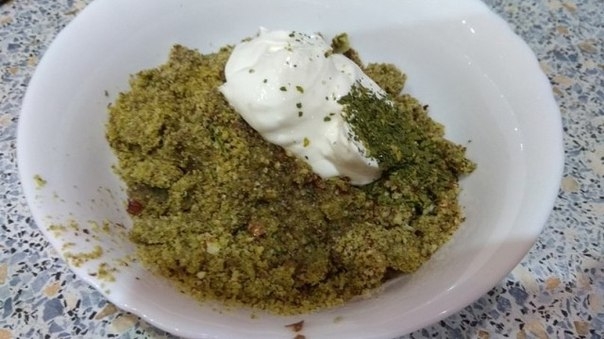 Измельченную массу соединить с сушеной зеленью и сметаной. Размешать до однородности.