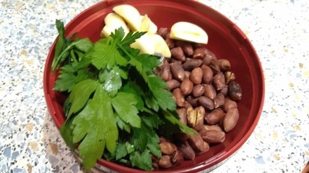 Для панировки в миксере измельчить орехи, свежую зелень, 3 зубчика чеснока. Орехи должны быть предварительно обжарены. Орехи можно использовать любые.