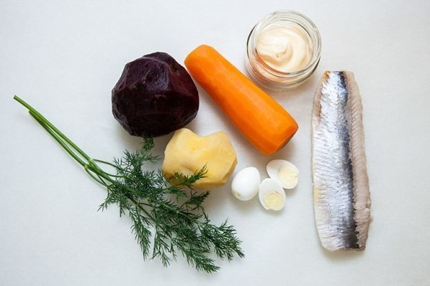 Отварную свеклу, морковь и картофель натереть на мелкой терке. Сельдь порезать кубиками.