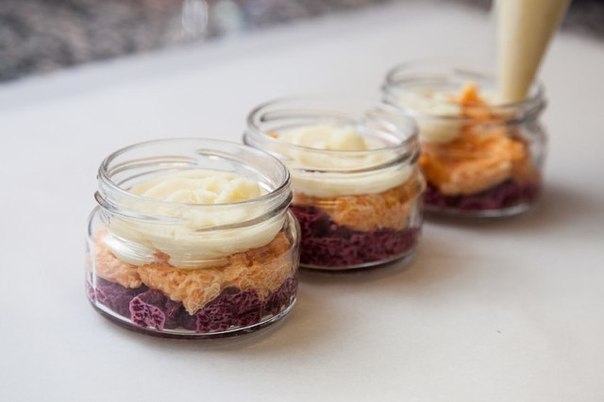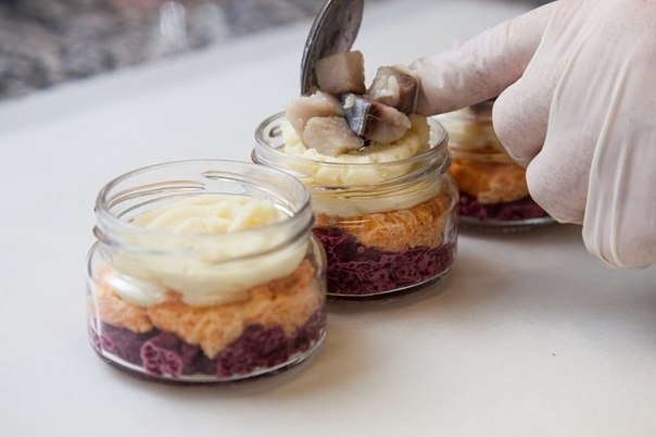 Выложить салат в баночки или широкие низкие бокалы слоями: свекла, морковь, картофель.