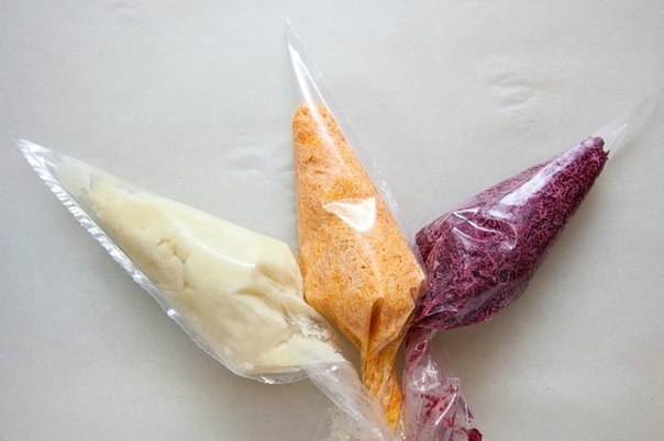 Свеклу, картофель и морковь по отдельности смешать с майонезом. Для удобства подачи салата можно выложить смешанные с майонезом овощи в пакеты.