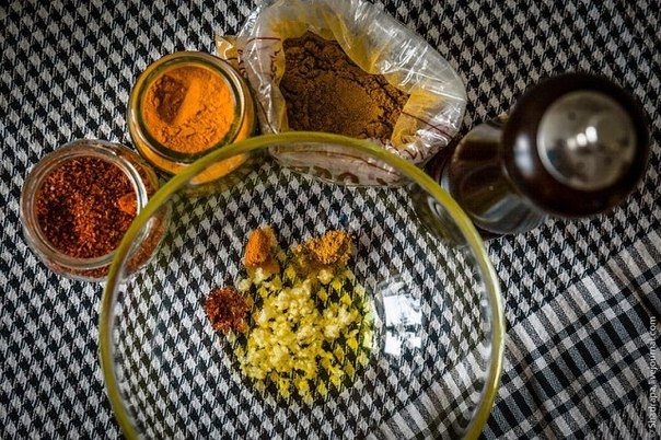 Замариную. Она уже готова, потому мариновать можно всего часик, если возьмете сырое мясо, соответственно, и время увеличивайте до 3-4 часов. Масло, чеснок, куркума, паприка.
