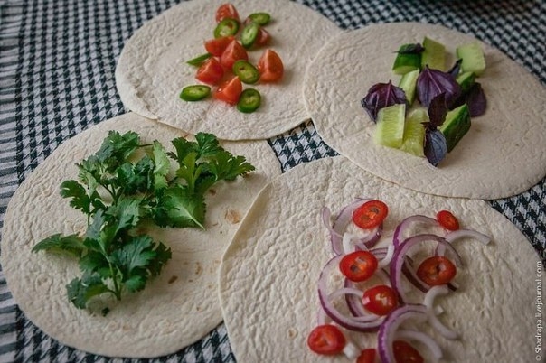 Встречались мне варианты этого блюда с картофелем-фри и даже рисом, так что разброс наполнителей ограничен только вашими вкусовыми предпочтениями и фантазией. Но, прошу вас, не горячитесь, засовывая всё подряд. У вас вкусное, довольно пряное мясо, кисленький соус с чесноком, лук и зелень, например – так не кладите же кислой капусты и корейской моркови с ярким уксусным вкусом.