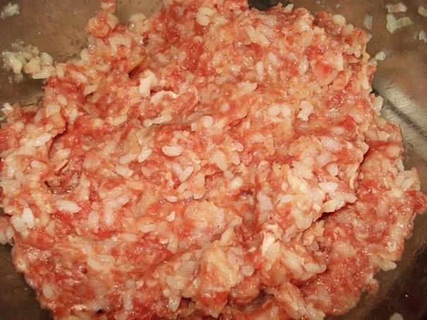 4. Смешать фарш, яйцо, лук, рис. Хорошо перемешать.